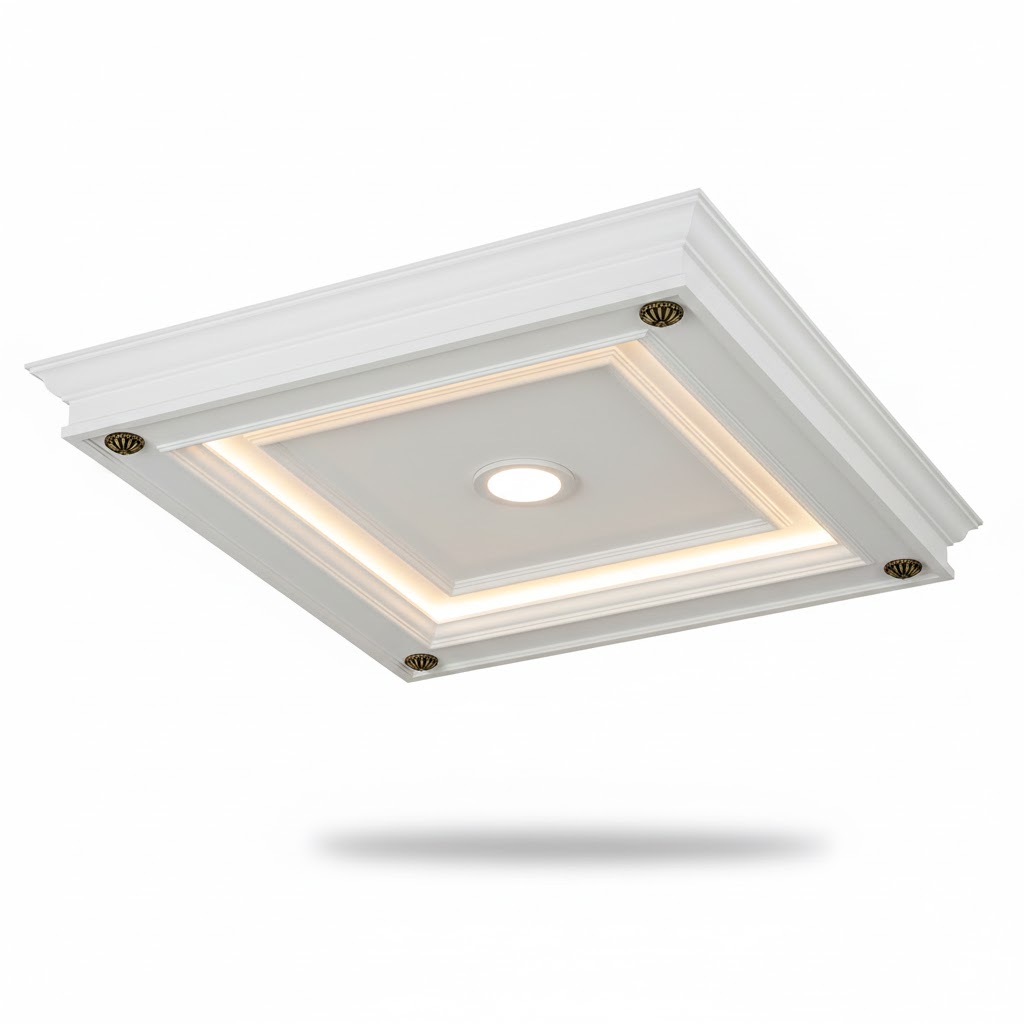 Recessed panels in a traditional style create depth and texture from the coffered grid ceiling. Living rooms or dining rooms needing a sophisticated touch will fit this design. It adds a little elegance and helps a space seem more spacious and modern.
