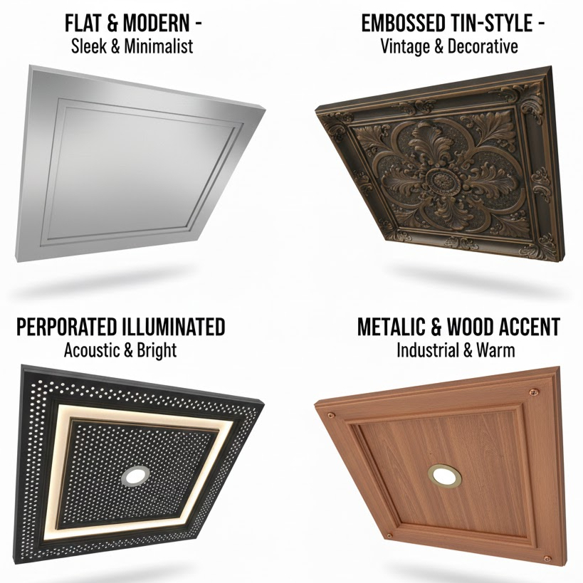 Including wooden beams into a grid ceiling gives your area character and warmth. For living rooms, kitchens, or even offices seeking homeliness, this design combines the rustic appeal of natural wood with the sleekness of grid lines.