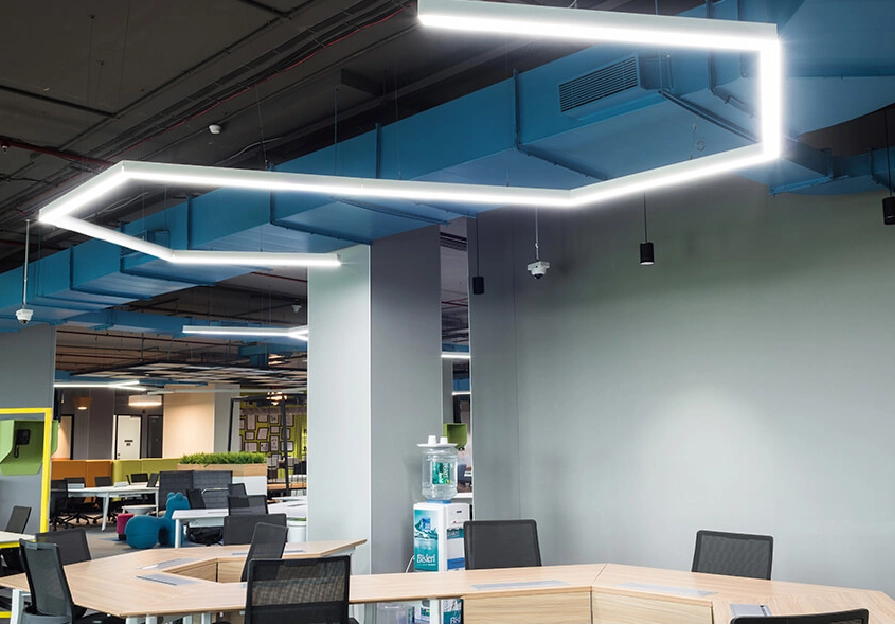 Features: Layered lighting plans, energy-efficient fixtures, workstation-focused illumination, mood-enhancing ambient lights.