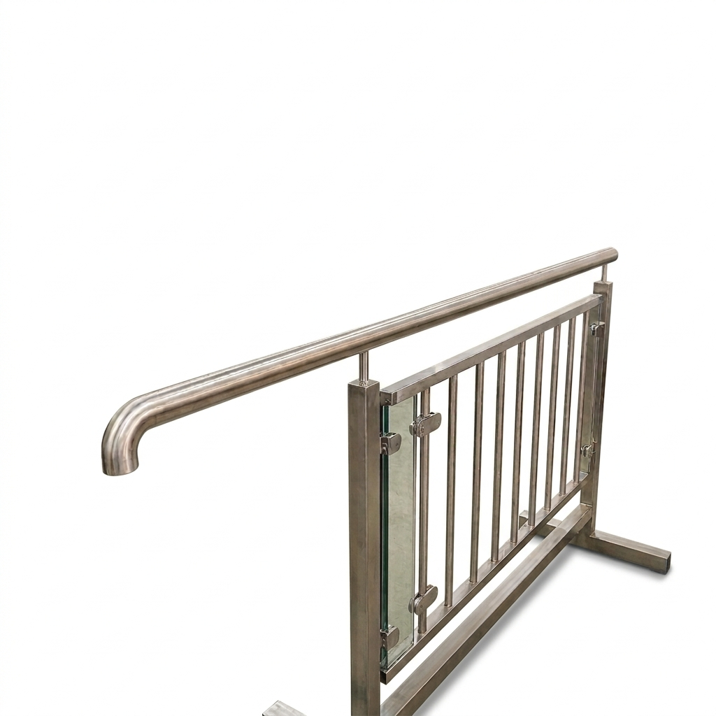 Features: Combination of stainless steel framework with toughened glass panels, rust-resistant finish, minimalist design, and high-strength fittings.